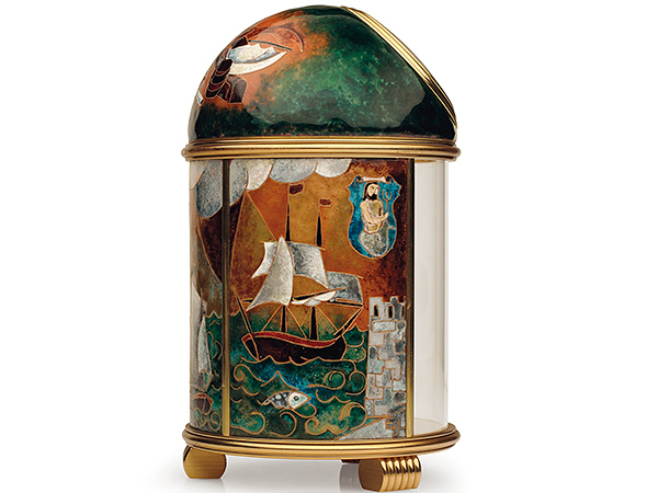 這枚座鐘在1978製作完成,高度為8.5英吋(約為21.6公分),外觀上的圖案以琺瑯所繪製,內容十分豐富。圓頂上繪有太陽,與鐘身底下的海洋相呼應,另外人物、船隻到建築物都能在這枚座鐘上看到,彷彿在看一幅歷史故事。帶有暈染風格的琺瑯彩繪,為這枚金質座鐘增添不少風采。