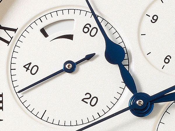 錶款是結合大日期的三眼計時碼錶,幾乎平面看不出高低落差的大日期盤,令人不可小覷品牌手藝。九點位置的小秒針盤則與動力儲存顯示整合,亦頗可愛。別出心裁的面盤佈局,來自於內裝的37-01自動上鍊機芯,這是格拉蘇蒂原創首枚自製計時碼錶機芯。