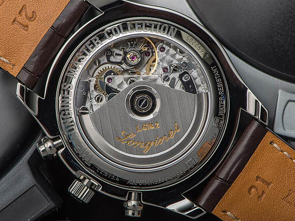這款一樣從三點鐘位置看起,這區塊留給浪琴的品牌logo,6點鐘則為同軸月相與12小時積算盤;9點鐘位置為小秒針與24小時顯示;12點鐘位置則是30分積算盤,裡面包含了星期與月份窗。看完面盤,看面盤外圈的日期刻度,搭配中央指針指示日期。最後還有與時、分指針同軸的中央計時秒針,小編光一一看完這些功能就快眼花了(笑)