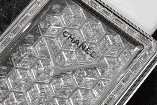 五款腕錶排列在一起的時候,老實說乍看之下有點看不出差異,但仔細端倪面盤的圖案,不難感受到香奈兒以精細的選石鋪敘出每款圖案組合的用心,隱密式鑲嵌的技法讓鑽石可以更加純粹地展現出原貌,在光線的折射下映照出火光。特別的是因應方形的錶殼,錶圈上也以方鑽鑲嵌,找出和錶圈折角處大小相符的方鑽,需經細膩的選石和精密的計算,加上面盤精心佈局的鑲工,展現出幾何的視覺魔法。
