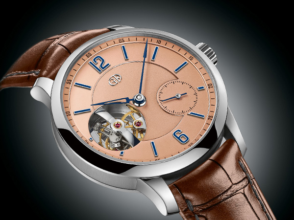 高珀富斯這款 24 Secondes Vision鉑金腕錶,鉑金錶殼配上橙粉紅色的「鮭魚」面盤,在寒冷的冬天看來格外“溫暖”與可口。9點鐘位置的24秒陀飛輪則是這款腕錶最大亮點,一般陀飛輪為60秒一周期,能做到特殊時間週期陀飛輪腕錶的大概也就以高珀富斯當作領頭羊。