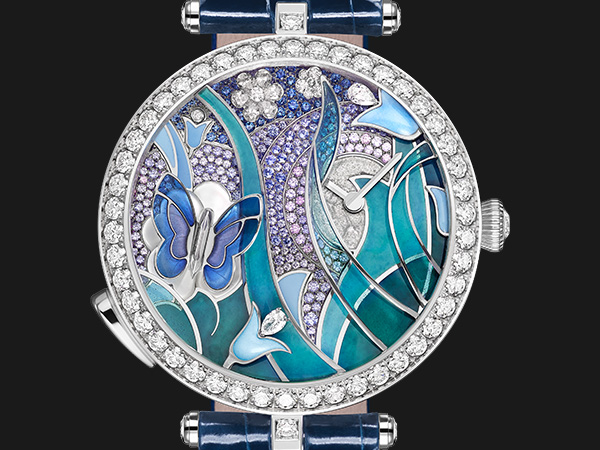 梵克雅寶繼去年推出的 Lady Arpels Ronde des Papillons腕錶,2017年推出的Lady Arpels Papillon Automate腕錶同樣以動物昆蟲作為主題,不過這次蝴蝶變為主角。結合彩繪玻璃琺瑯與珍珠母貝,按了旁邊的按把看面盤上的蝴蝶舞動是種很享受的事情!