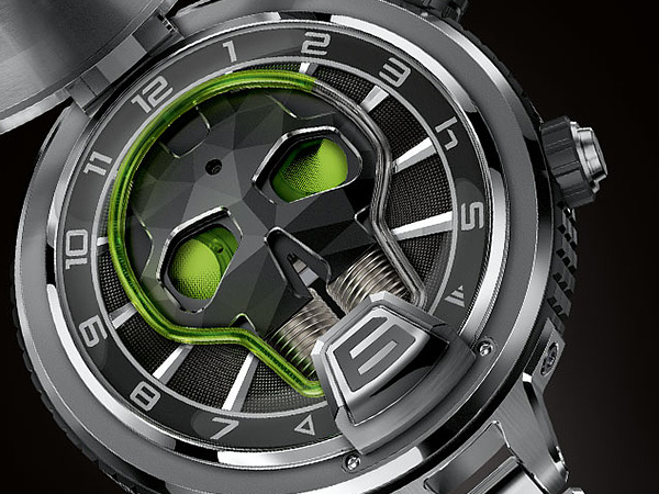 HYT家招牌的H1 Skull骷髏腕錶,這次除了超酷的液體顯示時間,以及超殺的骷髏頭加幫浦造型,這次推出了懷錶版,錶殼同樣以類鑽碳鈦合金做為材質。如此跳tone的設計,相信更讓錶迷印象深刻!