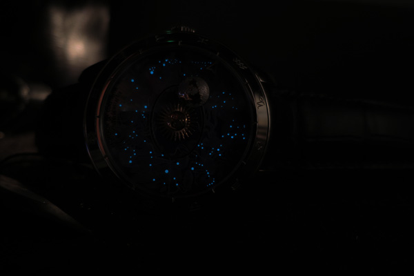 本篇主題是亮點,要說的是在這三款作品中,雷射雕刻的藍寶石水晶面盤,做工繁複,品牌還進一步在其中運用夜光塗料創造星空圖,平常看來沒怎樣,當吸夠光源又夠暗的時候,那可真的是一閃一閃兩晶晶了。