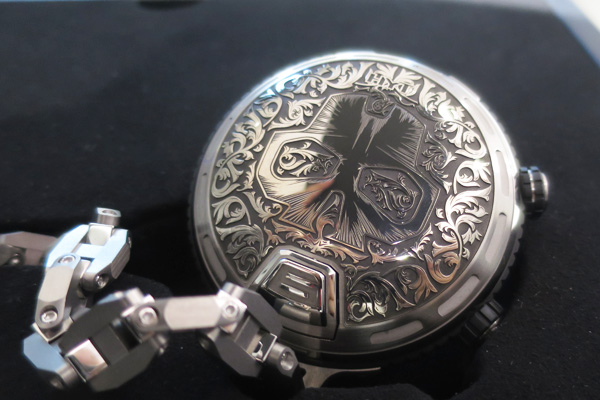而HYT此次亮點,則是全新Skull Pocket watch將獨特的骷髏腕錶再度演繹成懷錶。反正錶款尺寸很大,變成懷錶剛剛好。充滿重工業風格的蓋式懷錶,乍看硬邦邦,感覺打人很痛。展前發佈的款式網路都找得到圖,而這次發現一只獨一無二的客訂錶款,以金雕裝飾錶蓋,刻上搖滾味道十足的骷髏圖案。感覺...打人更痛了。不過,錶款大重點當然是打開蓋子之後啊!