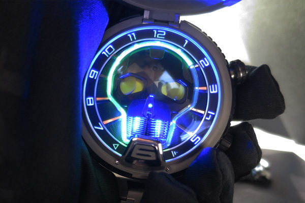 結合前兩年開發出的手上鍊Led發光結構,轉動四點位置的錶冠,可以為Led發光機制提供電源。接著壓案四點位置的按鈕就會發光,無需吸收光源,也不用裝電池,就可以光亮到在夜店也顯而易見!Led主要裝在六點位置的幫浦下方,當開始發光時,不只映襯著多切面形貌的骷髏更酷,時間刻度、綠色液體顯時的亮度根本就像是螢光燈管一般。光亮可以直接射到蓋板喔!