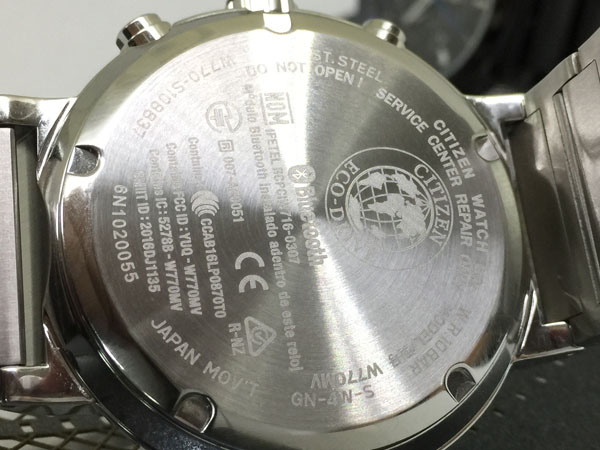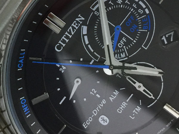 熟知CITIZEN的族群,對於他們的獨家強項光動能Eco-Drive應該都不陌生,新款的藍牙腕錶當然也不例外的使用光動能驅動,在開啟省電模式的滿電狀態下,正常來說手錶可維持大約四年的運作。而要連接藍牙腕錶和智慧型手機,必須在手機裡下載官方的應用程式,透過APP的操作,可以設定316城市的世界時間,完成兩地時間的設置。而有來電或是Line、Facebook等收到訊息時,手錶便會震動提醒,原本的藍色中央秒針也會跳到"CALL"或"INFO"的狀態進行提醒,來電可以從通訊錄裡選擇32組會進行通知的聯絡人,也可以選擇全部聯絡人,這樣一來所有的來電就都會通知。另外,透過面盤的感光亮度等級指示,也可以了解腕錶目前的電量狀況。