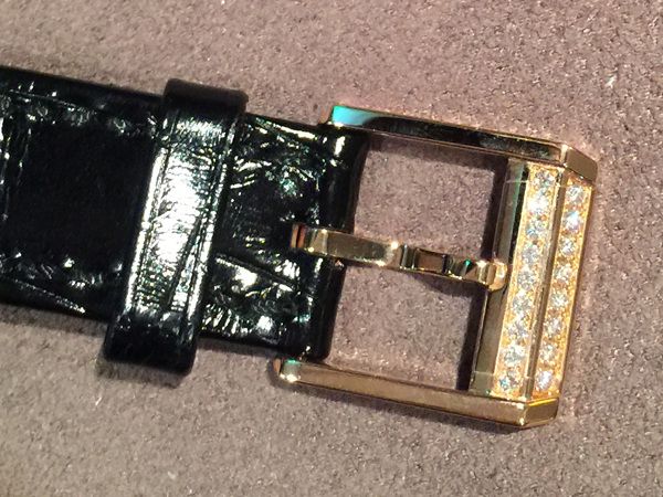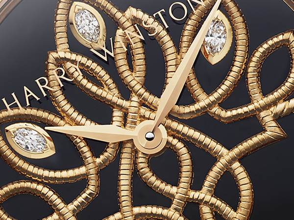 而面盤的重頭戲除了金質雕刻之外,還包括大明火燒琺瑯,以攝氏800度至900度的高溫燒製而成的琺瑯面盤,是許多工藝錶款都會使用的技法,HARRY WINSTON將亮澤光滑的琺瑯面結合黃金亮片,讓錶面看起來彷彿有砂金石般的效果,和以黃金雕刻的紋飾相輝映,加上面盤上的馬眼型切割鑽石,以及鑲鑽錶圈,用多項工藝的結合拓展出珠寶腕錶的可能樣貌。