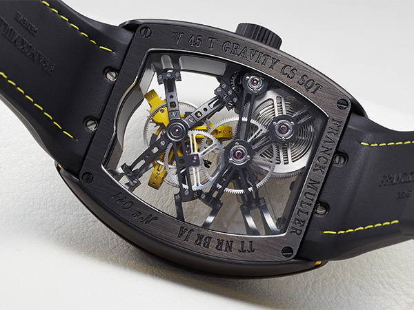 從法穆蘭Gravity Skeleton腕錶背面可以看到更清楚的輪系排列,鏤空的發條盒也可以做為動力儲存顯示。錶殼6時位置向外凸出,是為了要讓大型陀飛輪經過。
