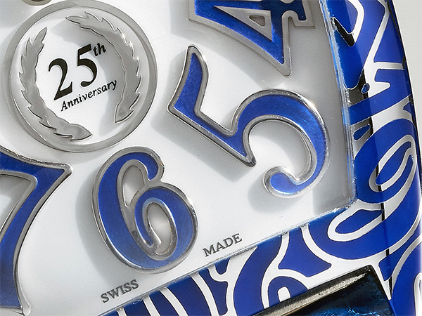 法穆蘭Cintrée Curvex 25周年紀念腕錶錶殼上看似無意義的紋飾其實也是一連串法穆蘭設計的阿拉伯數字,與裝飾性極強的時標是相同的。拿標誌性的數字來幫錶殼紋身,也是創意十足了。