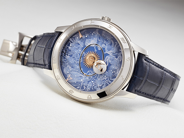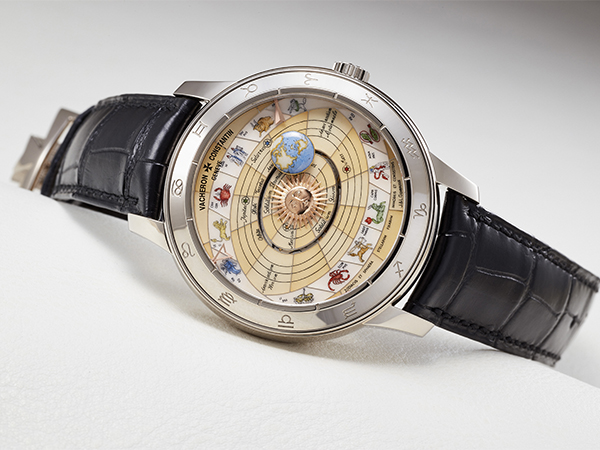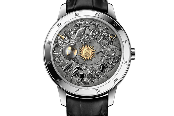 Coprnicus celestial spheres以白金為基底的面盤,立體浮雕黃道十二宮圖。中央的太陽與圍繞其運轉的地球上的五大洲則以黃金裝飾,頗有巴洛克韻味。是這系列的第三種藝術手法。直徑43mm/18K白金/參考價NTD 3,540,000
