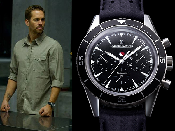 首先來看一下已故好萊塢影星保羅沃克(Paul Walker)所飾演《玩命關頭》元老級始祖的歐康納(Brian O'Conner),在第六集中佩戴的積家Deep Sea Chronograph腕錶。小編不知道是置入性行銷,還是保羅偏好潛水錶,在飆速的賽車影片中佩戴潛水錶還蠻跳Tone,不過也很特別。Deep Sea Chronograph腕錶靈感來自1959年的Memovox Deep Sea腕錶,錶背上雕刻著蛙人被氣泡所環繞的圖案,正說明了本只腕錶的特色。