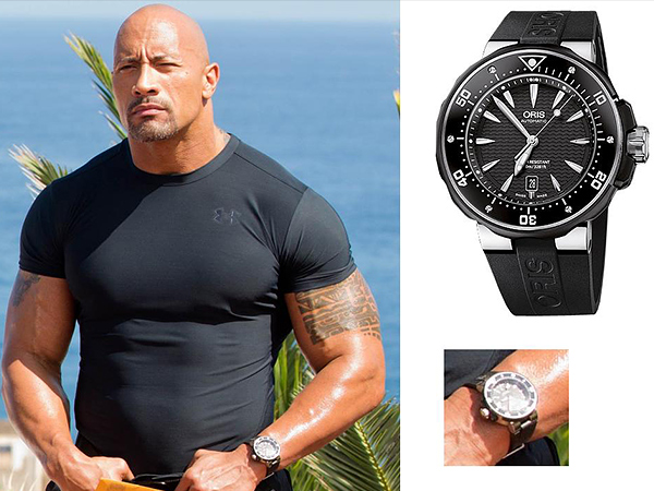 再來看到的不是第八集變成大反派的馮迪索(他似乎不喜歡佩戴腕錶),而是另外一位同樣擁有帥氣光頭的巨石強森(Dwayne Johnson),在片中飾演的Luke Hobbs佩戴超大錶徑的ORIS ProDiver Date潛水錶(感覺玩命關頭主角們都喜歡佩戴潛水錶)。先來看看他的錶徑有多大-48mm,十分適合手臂粗壯的巨石佩戴;厚度也是十分驚人-17mm,比起現在動輒比薄比輕盈的腕錶,算是相當巨大豪邁的腕錶。