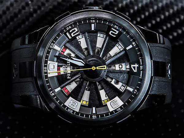 渦輪葉片會隨著手部晃動而旋轉,外圈上標示著阿拉伯數字時標顯示分鐘刻度。而在渦輪葉片下方,能看到6到8點鐘位置的分鐘刻度以黃色呈現;8到12點鐘的分鐘刻度則採用紅色,十分符合賽車亮麗的顏色!另外這款腕錶還有一個特別之處,為了配合左手握方向盤時的手勢,因此將面盤12點鐘時標刻度移到2點鐘位置,其他時標也跟著偏移,即使握著方向盤時,時標12基本上也朝著正上方,更易於判讀時間,這種偏心設計可說十分貼心。錶殼直徑44mm,採用黑色PVD不鏽鋼材質,搭載品牌自製P331自動上鍊機芯,限量350只。