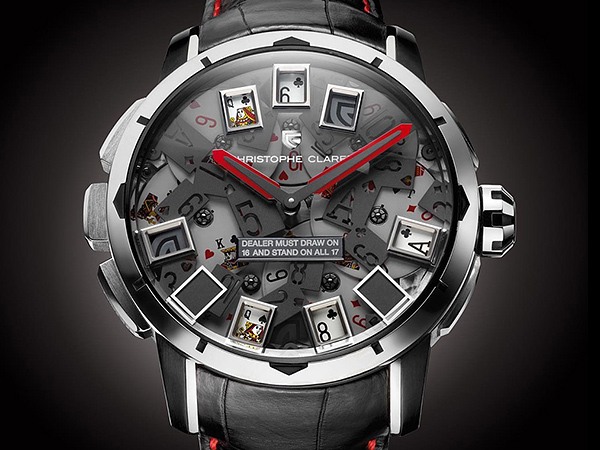 能玩的腕錶,除了迷宮,拿來玩卡牌也不錯。這裡要分享的是CHRISTOPHE CLARET 21 Blackjack腕錶,聽名稱就知道可以拿來玩21點黑傑克,幾位朋友還可以拿來開局呢!21 Blackjack面盤下方顯示一位玩家、共有六格紙牌窗、面盤上方的3格紙牌窗則顯示莊家所持紙牌。