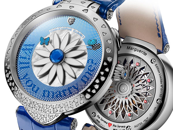 再來同樣看到CHRISTOPHE CLARET,其在2016所推出的Marguerite腕錶。這款腕錶的白花與蝴蝶不是吸引小編的重點,而是藏在花瓣下的秘密。平常面盤呈現3、6及9時的阿拉伯數字時標,不過在面盤底下藏有第二個面盤顯示。