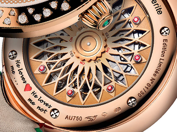 而藍寶石水晶錶背同樣可以欣賞特殊機制。機芯鑲嵌8枚紅寶石、被刻成雛菊造型的擺輪。佩戴者還可玩「他愛我,他不愛我」的遊戲。操作時腕錶必須放置於水平位置,佩戴者輕輕搖動腕錶一至兩下,令擺輪轉動數秒後靜止,最接近紅心的紅寶石會顯示答案──中心會顯示「是」或「否」。真希望在心儀女生面前永遠都能轉到「是」這個答案啊!