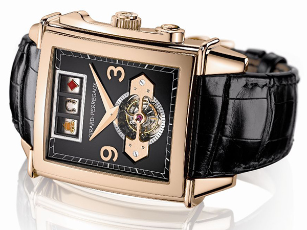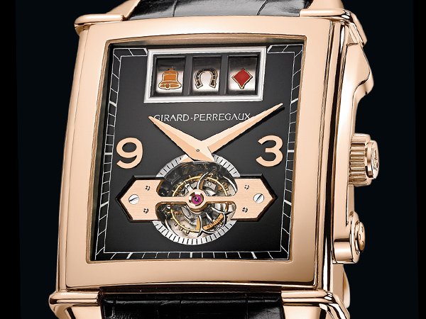 芝柏表GIRARD-PERREGAUX Jackpot陀飛輪腕錶在2007亮相,結合了陀飛輪、角子老虎機以及自鳴裝置三大複雜功能,可說集娛樂、技術與工藝於一身。腕錶一開始映入眼簾的為面盤12點位置的三個滾筒,分別印上五個符號圖案。