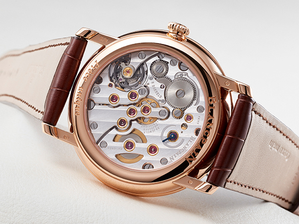 內置細膩修飾的13R3A手動上鍊機芯,備有3個串連發條盒,動力儲存長達8天,為了不破壞面盤的美感,動力儲存顯示做在機板上。