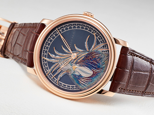 以4478米的馬特洪峰作為背景,兩隻瑞士鬥牛正在爭王,山峰層疊,而寵滿力量的鬥牛如浮雕般栩栩如生,牛隻雕殼極為精細,是赤銅工藝的絕品。背景為銅材質,牛隻為玫瑰金。在背景與牛隻雕刻完成後,將兩者結合,再經銅鹽溶液處理,而產生灰綠色澤,之後鑲上黃金項圈部分,最後進行項圈金雕。面盤本身就是一件手工藝術品。42mm/玫瑰金/NTD 5,113,000
