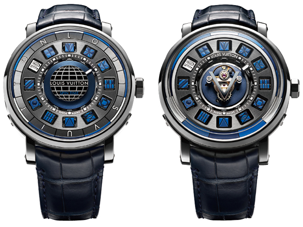 2017年LV首登場的新錶,是以2016年錶界大行其道的藍色為主調,推出的Escale Spin Time Blue和Escale Spin Time Tourbillon Central Blue兩款新作。Escale Spin Time Blue的顯時和系列前幾款錶一樣,以方塊顯示小時、指針指示分鐘,特別的是分針上方以象徵經緯線的地球圖案覆蓋,品牌名稱落在有如赤道的位置,平衡地成為視覺重心,剛好是十二個字母的"LOUIS VUITTON",也在面盤外圈劃分成輔助顯時的十二等分。另一款中置陀飛輪亦是年度重點錶款,它是Escale系列的首款陀飛輪、也是LV第一款中置陀飛輪,而品牌旗下的陀飛輪都是V型框架設計,這是源自Gaston Vuitton在1901年為Steamer Bag設計的V字靈感。