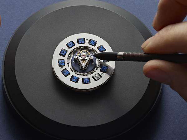象徵品牌意象的V型陀飛輪框架置於面盤中央,齒輪下方的機板以藍色噴砂處理,面盤外圈採用深淺藍以及白色交錯的配置,搭配以移印技術(Pad Printing)手繪的旋轉方塊,將原本Escale系列的手繪彩色方塊全部改成轉印式的藍化處理,雖然工序上轉印似乎會比手繪來得容易,但是因為全部都是單一的藍色,在設計上要做出有層次的立體感,反而比彩色還要顯得困難些。細看錶款的細節設計得很用心,視覺上看起來有著單一顏色的雅致,卻又有著立體的層次感,細部的拿捏堪稱恰到好處,讓人對於LV 2017年後續的新作也多了不少期待。