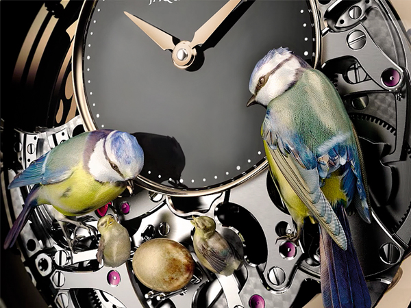 自從雅克德羅JAQUET DROZ於1785年時首度將活動人偶功能加進懷錶設計中之後,就開啟了人偶與問錶結合的濫觴,這兩項結合視覺與聽覺的功能,讓腕錶更加精采,因此首先就來介紹雅克德羅的Bird Repeater腕錶。這款Bird Repeater腕錶是一款活動人偶搭配三問報時功能的複雜腕錶,面盤上的活動零件就多達八種,也是目前活動人偶中最複雜的一款設計。
