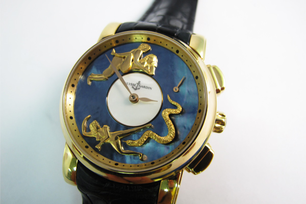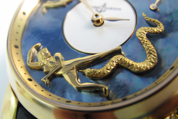 雅典錶ULYSSE NARDIN的人偶技術十分多樣,品牌也不斷加以改良推陳出新,像是在1989年就將活動人偶機械裝置融入四錘三問腕錶之中,1993年又發表了聖馬可系列活動人偶小自鳴單問腕錶,因此結合活動人偶、問錶與音樂錶已經是雅典錶複雜功能款式的一大特色。小編在這裡要介紹的是這款雅典錶春宮自鳴單問腕錶,面盤上方除了正在恩愛的男女外,下方多了《聖經》中夏娃與撒旦裝成的蛇,更增添其色情誘惑。