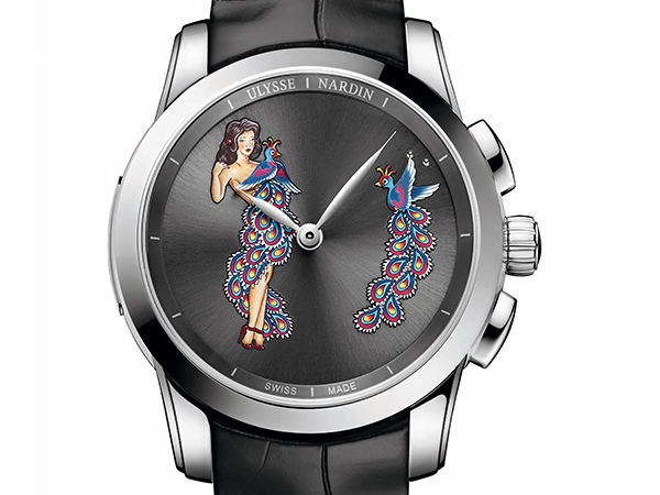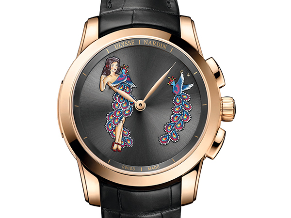《舞孃單問報時限量錶》共推出白金與玫瑰金兩款,配上UN-610自動上鍊機芯,動力儲存42小時。面盤上的舞孃與孔雀是由雅典錶專屬微繪畫師所繪製,使用丙烯酸漆作為顏料,畫風細緻,將舞孃挑逗神情以及孔雀羽毛與姿態都呈現的唯妙唯肖,尤其在黑色放射紋為底的面盤上登場,更令人驚艷!