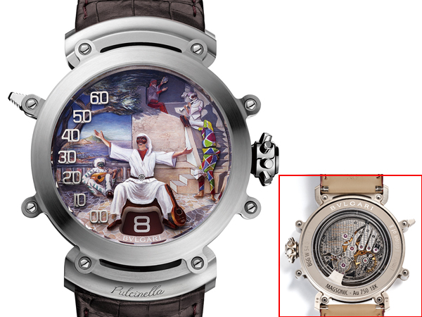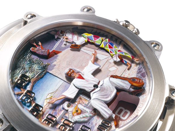 最後來看寶格麗BVLGARI這款Commedia dell'Arte 即興喜劇三問錶,除了活動人偶與三問外,也充滿了各式藝術技藝。由日內瓦Ateliers Vauche工坊製作的面盤,包含了金雕以及微繪,面盤共分為四個層次所繪製。至於面盤上的主題則是起源於16世紀義大利的「Commedia dell'arte即興喜劇」,以維蘇威火山和那不勒斯作為背景。而中間著白衣僕人服的角色為Pulcinella(名稱標示在下錶耳上),張開著雙手與周邊樂手們一同演奏。